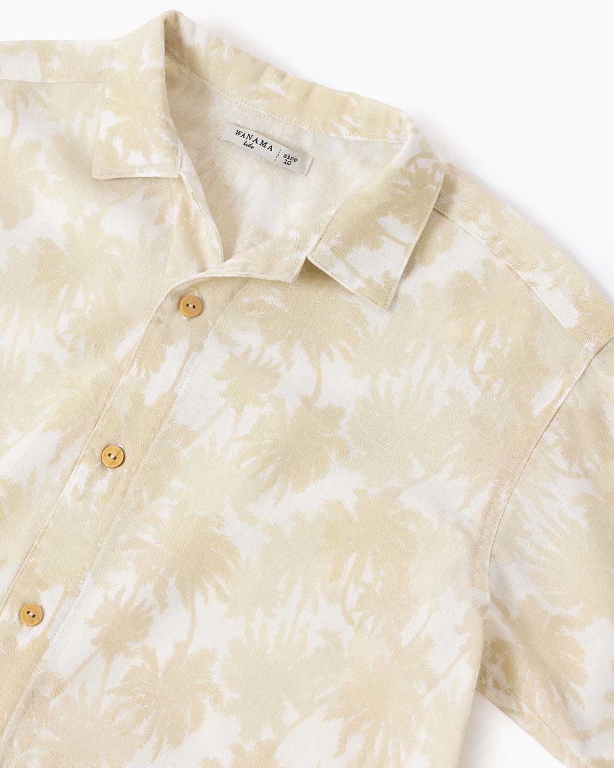 Camisa de manga corta con calce relajado y cuello más abierto. Tiene botones de madera. La estampa es exclusiva y tiene un proceso de lavado. La composición es lino.