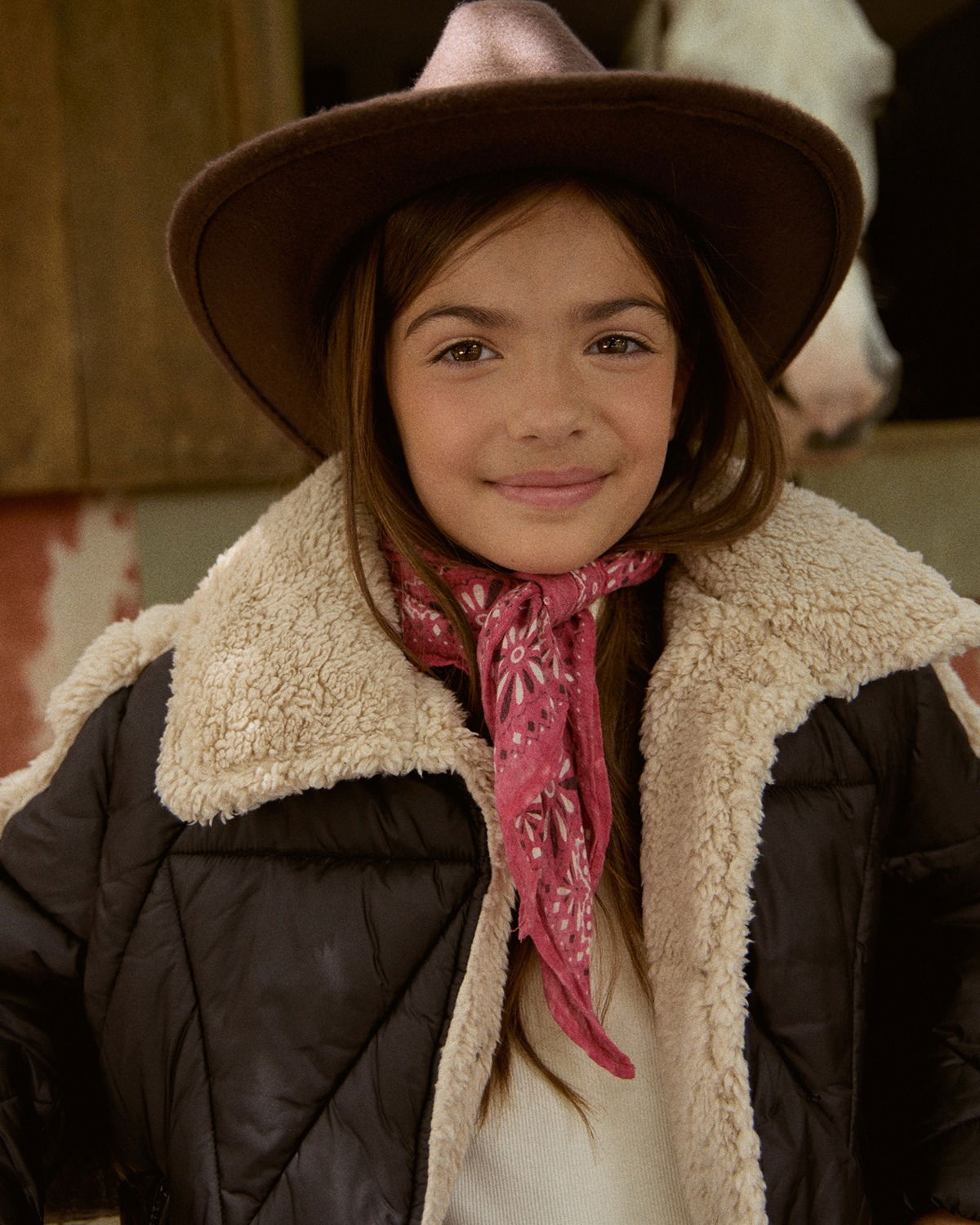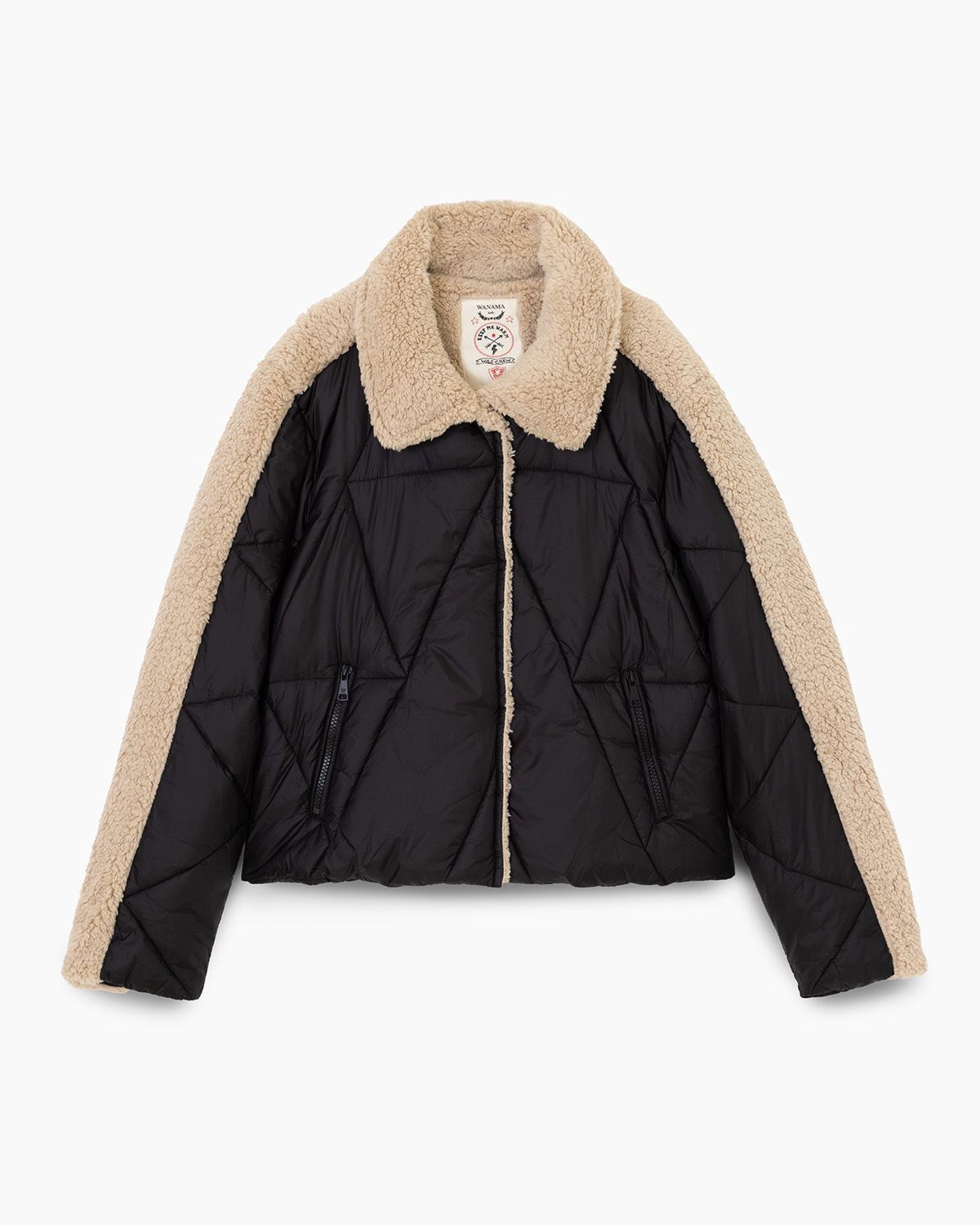 La Campera Lola combina texturas de corderito y nylon en un diseño corto y abrigado. Posee relleno de guata artesanal y acceso mediante broches en la cartera frontal.