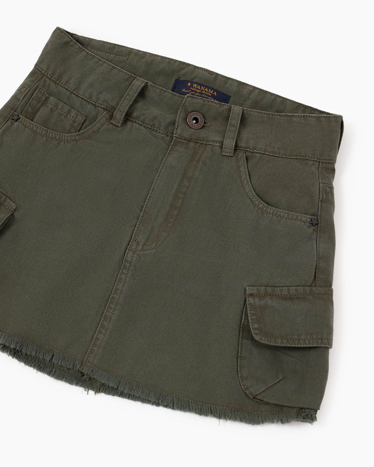 Confeccionada en gabardina 100% algodón, esta mini tiene un calce relajado. Los bolsillos laterales con tapa le dan un estilo cargo. La cintura con elástico interno regulable, hasta el talle 8 inclusive, asegura un ajuste perfecto.