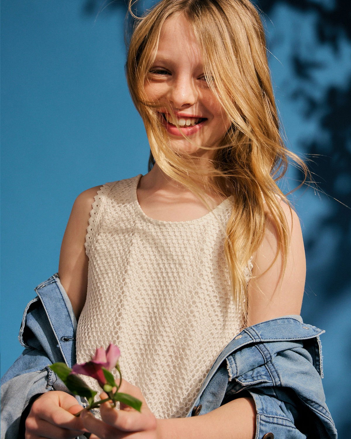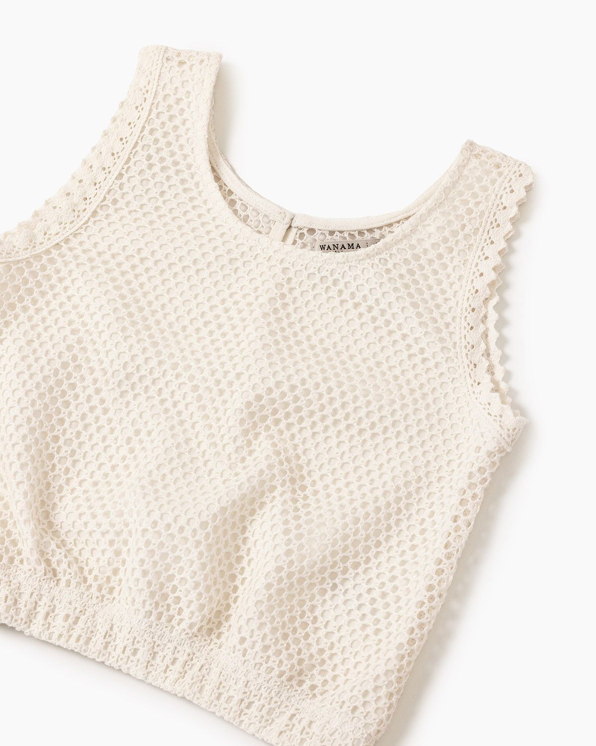 Confeccionada en red y jersey 100% algodón, esta musculosa tiene la parte delantera forrada y un calce relajado con largo por debajo de la cintura. La cintura cuenta con elástico interno y las sisas con delicados detalles de puntilla.