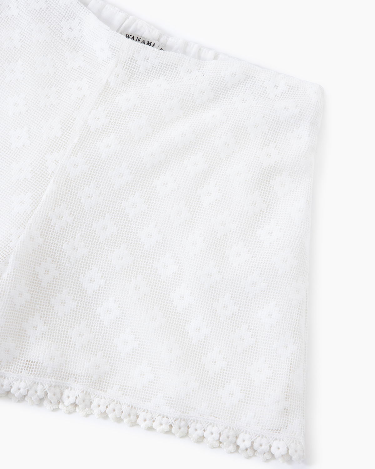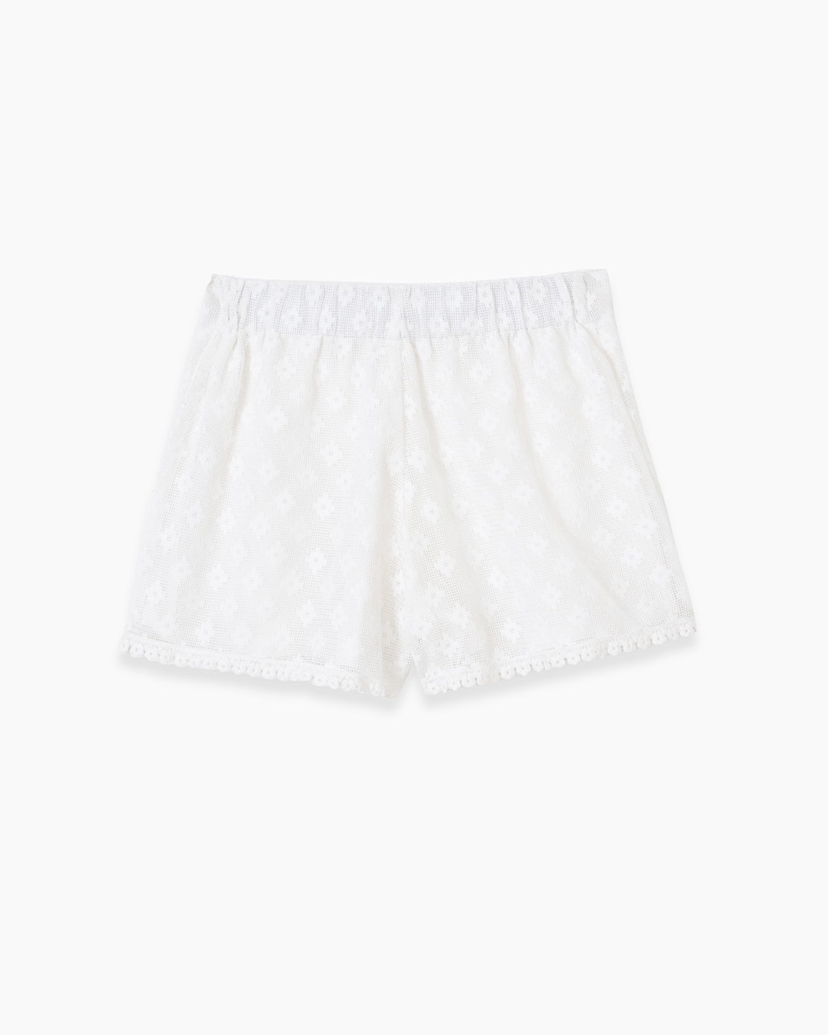 Short confeccionado con encaje de algodón. Forrado completamente en voile liso. Posee detalle de terminación con puntilla. cintura plana en delantero y elástico en espalda. Nos encanta combinarlo con el top Alexia para un total look y también con remeras estampadas como la remera Groovy para un look mas playero.