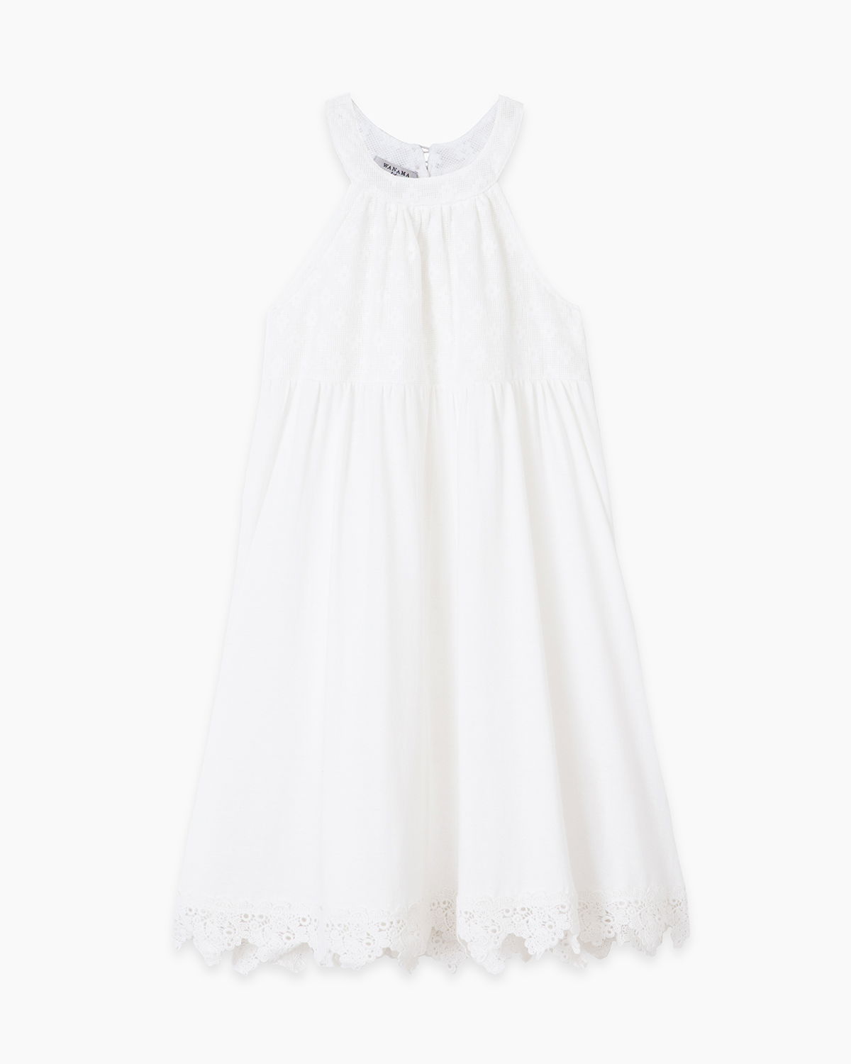 Vestido confeccionado en jersey 100% algodón con pechera de encaje. Posee escote en espalda que se abrocha mediante botones y ojales elásticos. Nos encanta usarlos con zapatillas para un look mas relajado y con sandalias para alguna ocasión especial.